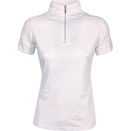 Chemise de compétition à col montant blanc avec fermeture à glissière courte et cristaux colorés tout autour, partiellement doublée de dentelle ton sur ton sur le devant et dans le dos.