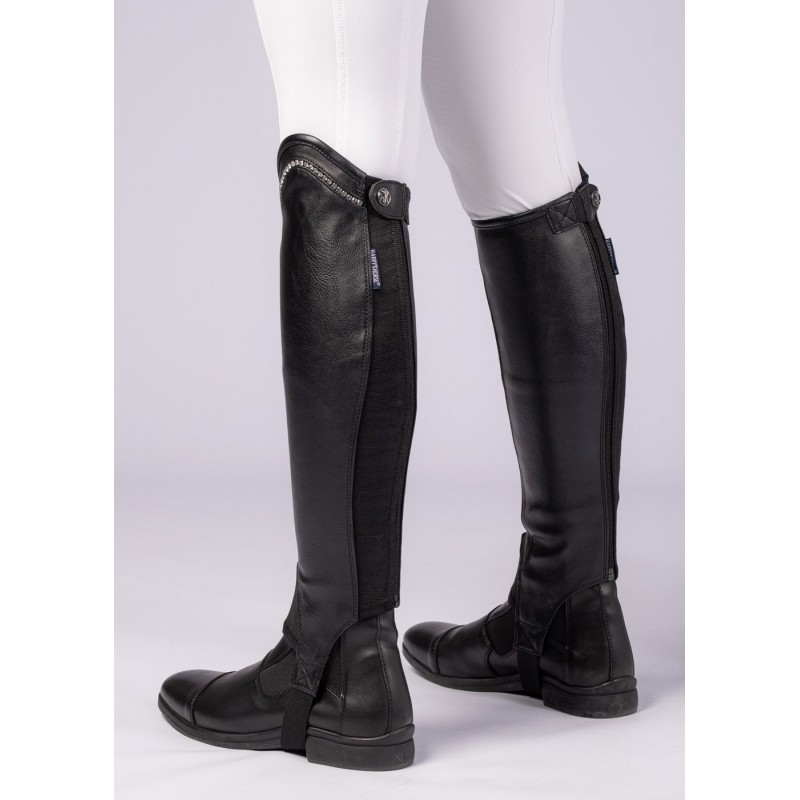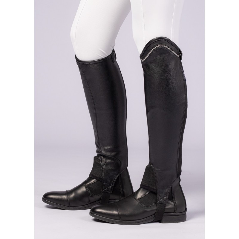 Minichaps avec partie élastique au niveau du mollet et fermeture éclair à l'extérieur. Fabriquée en matériaux synthétiques de haute qualité. Une rangée de cristaux luxueux le long de l'arc de dressage.
