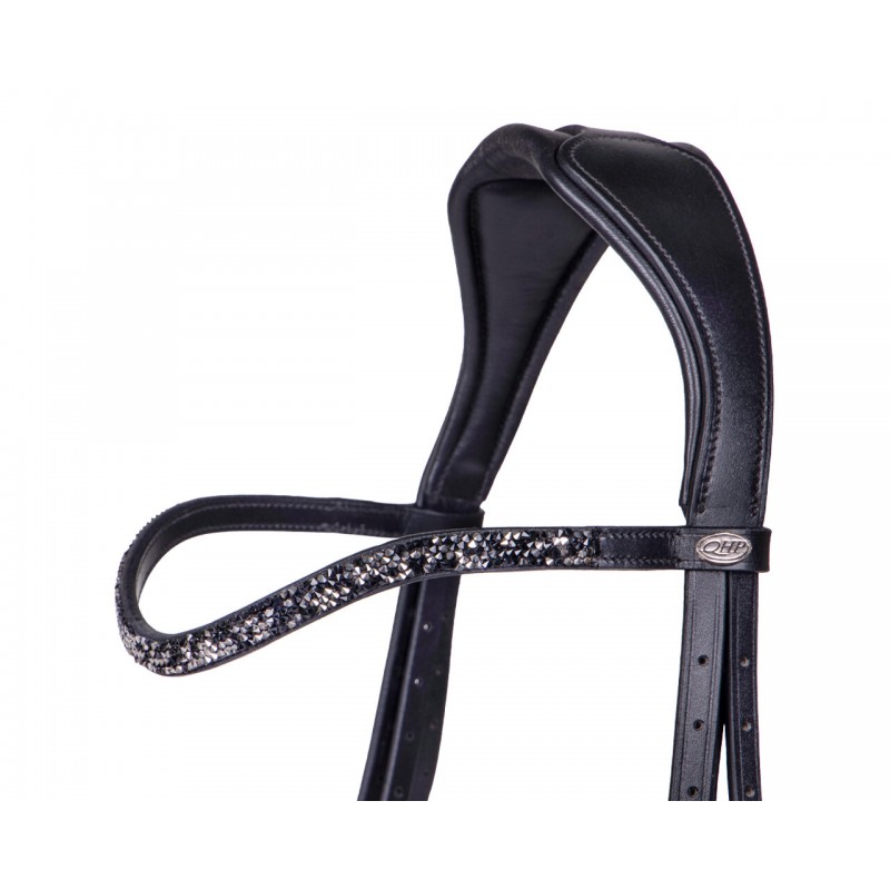 Cet élégant bridon avec muserolle en cuir verni est la combinaison parfaite de l'élégance et du confort. Le frontal est recouvert de strass en forme de diamant qui scintillent magnifiquement. Grâce à la têtière de forme anatomique et à la muserolle avec un rembourrage souple, la bride est très confortable à porter.