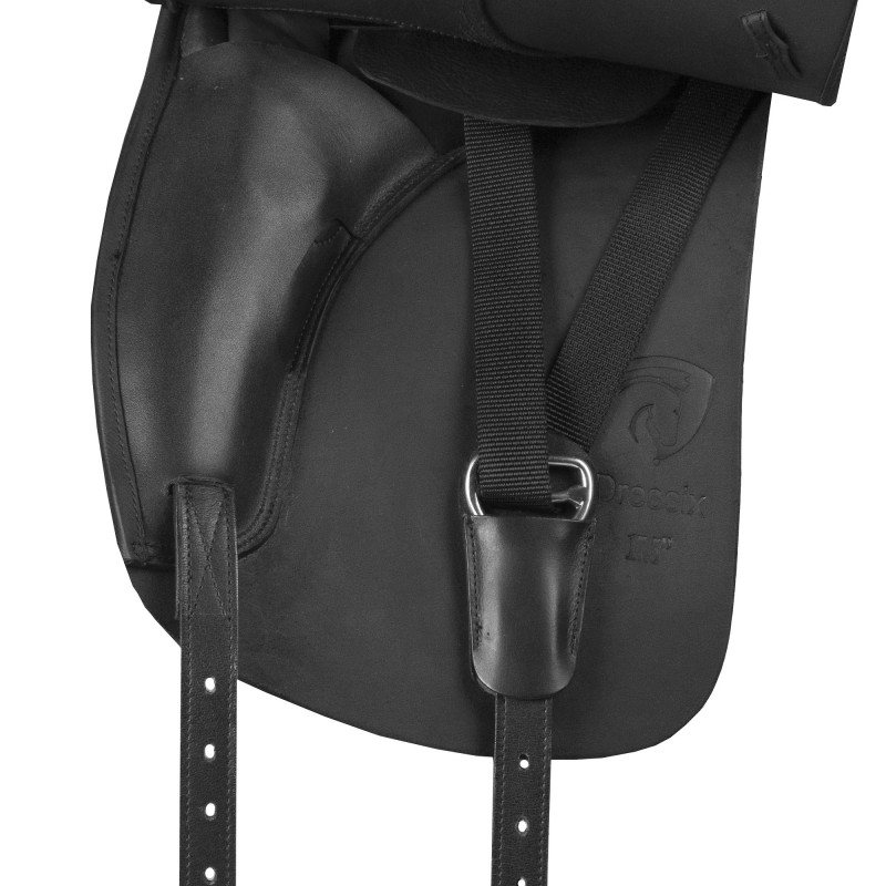 Selle de dressage en cuir double de belle facture avec un siège doux et profond. La Dressix est équipée d'une têtière interchangeable, ce qui permet à cette selle de convenir à différents types de chevaux. D'autres tailles sont disponibles séparément. Le rayon anatomique du genou aide le cavalier à trouver la bonne position sur la selle. Le canal moyennement large du coussin assure la liberté de mouvement des vertèbres et les coussins doublés de laine assurent une répartition optimale de la pression sur le dos du cheval.