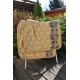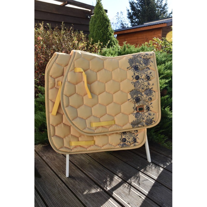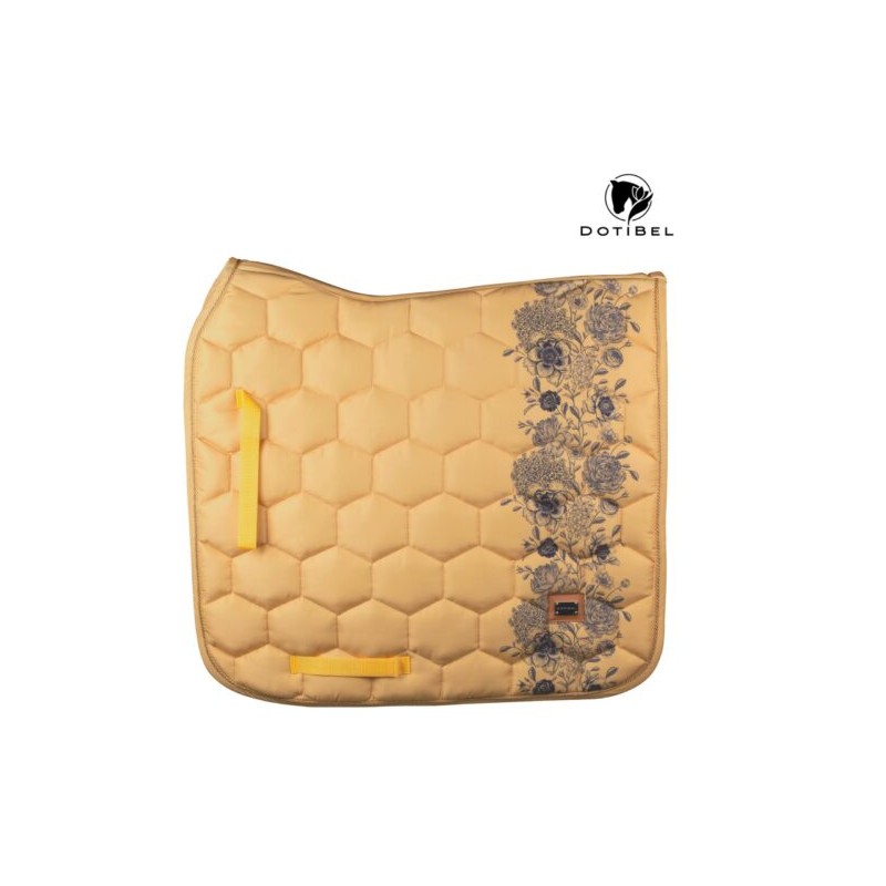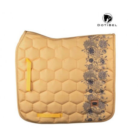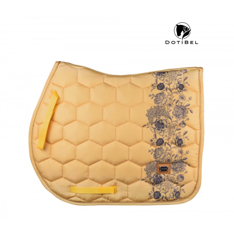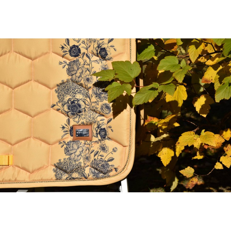 * Un tapis de selle unique en jaune miel avec une bande de roses d'encre noire.