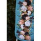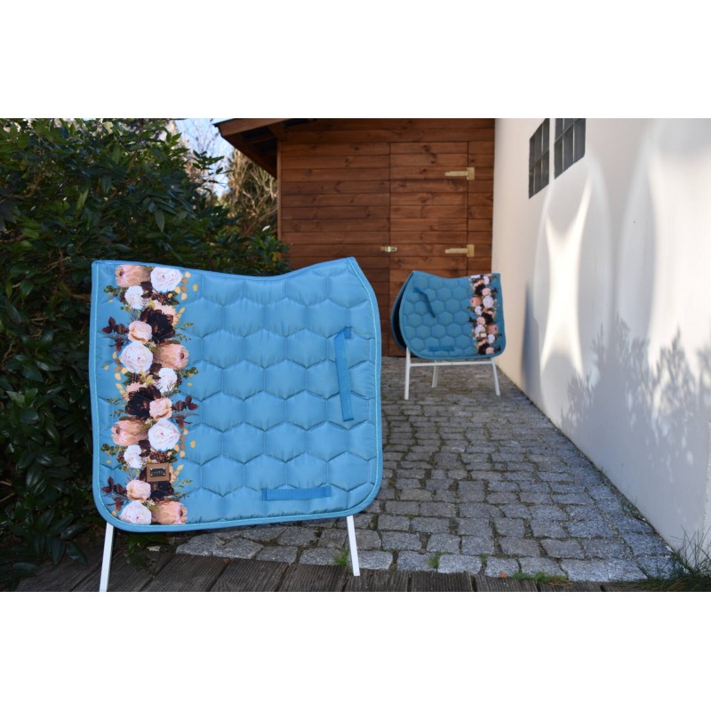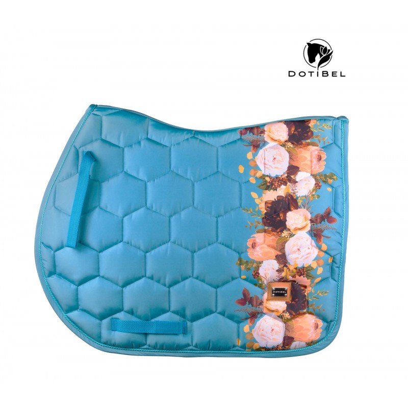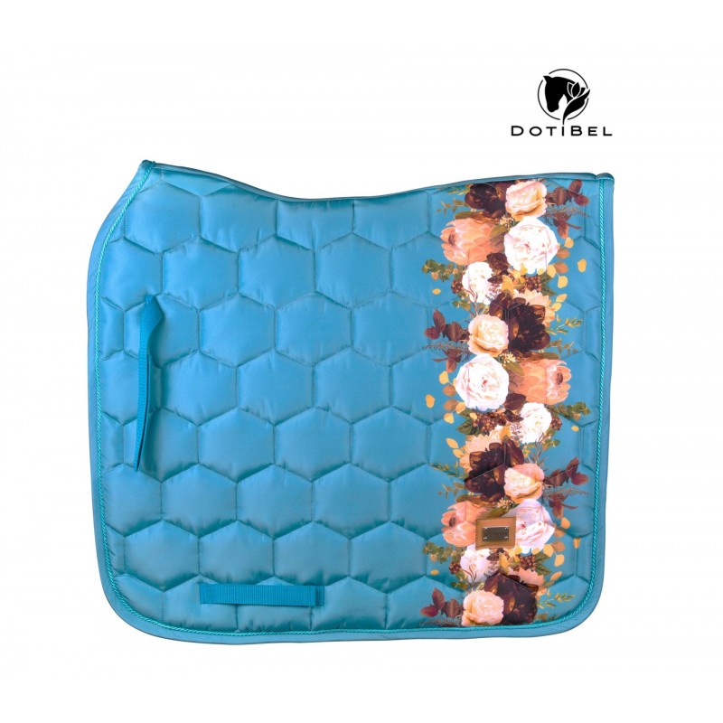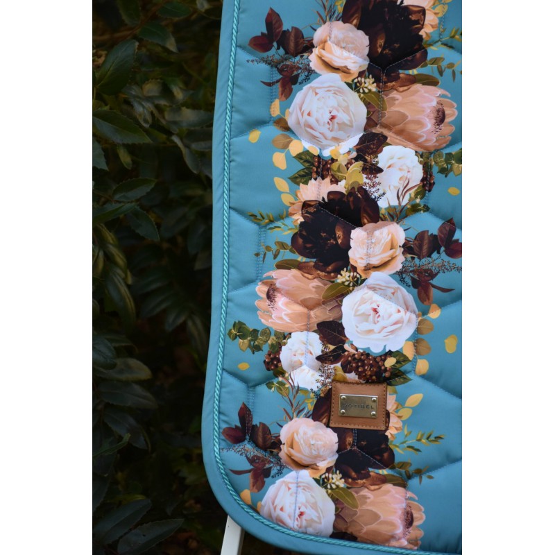* Un tapis de selle d'une belle couleur turquoise avec une bande de prota et de roses en marron et beige.