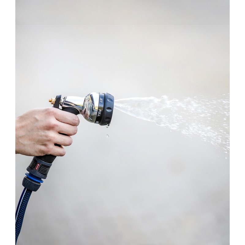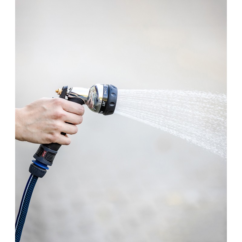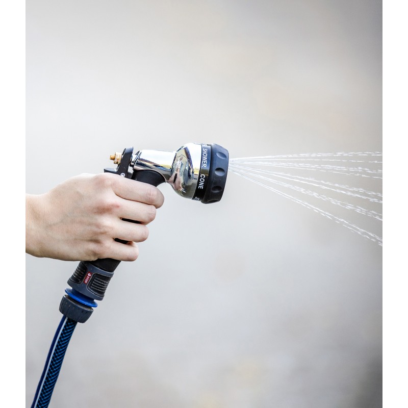 Douche robuste en plastique de qualité supérieure. Avec 7 profils d’aspersion et son jet large à étroit, fort à délicat, cette douche multifonctions en laiton est l’idéal pour toutes les utilisations à l’écurie et en déplacement. Réglage continu de la puissance du jet et gâchette de blocage pour une pulvérisation de longue durée. Facile à utiliser d’une main.