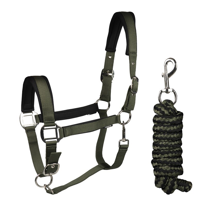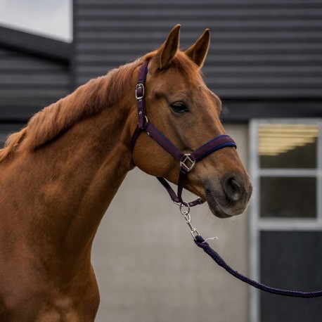 Licol avec longe de 200 cm. Le licol est rembourré en néoprène au niveau de la têtière et de la muserolle et est réglable des deux côtés de la têtière.