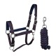 Licol avec longe de 200 cm. Le licol est rembourré en néoprène au niveau de la têtière et de la muserolle et est réglable des deux côtés de la têtière.