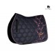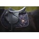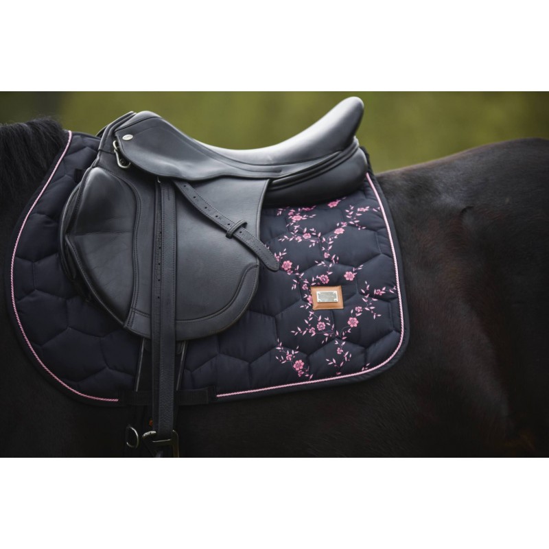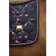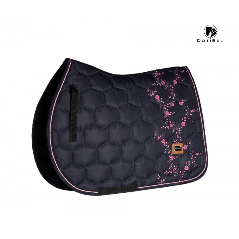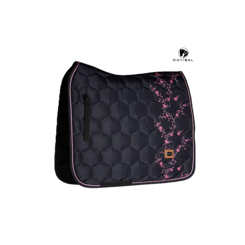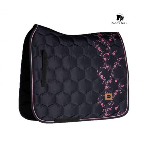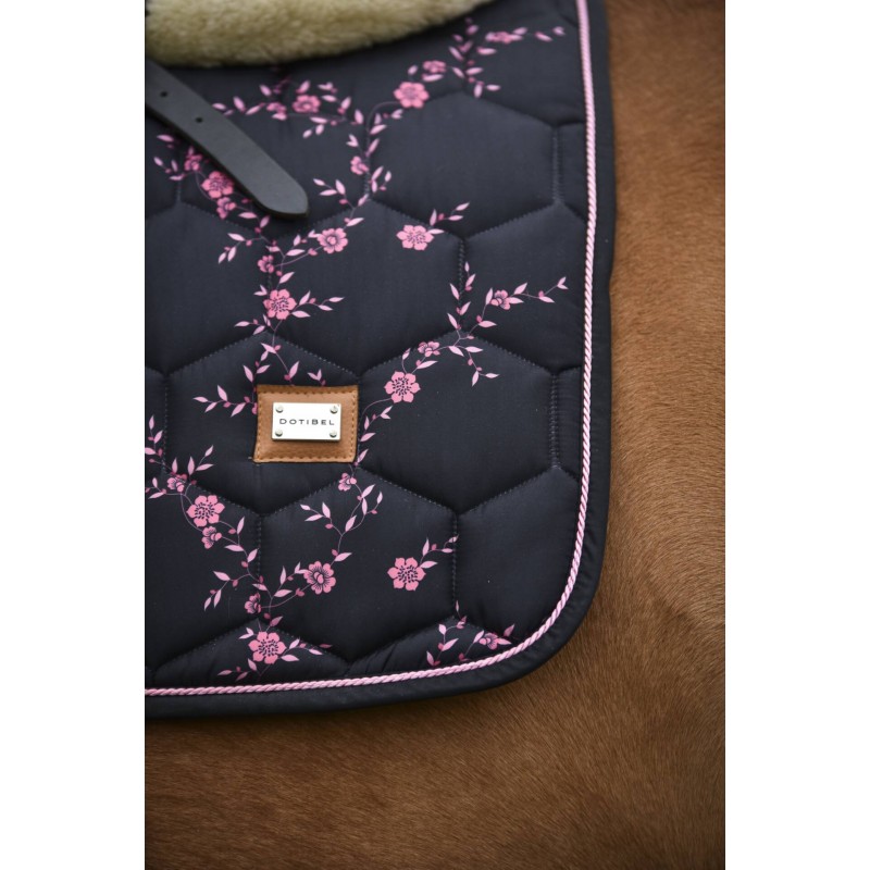 Tapis de selle en noir avec de minuscules fleurs roses. L'éclat satiné subtil caractéristique de DotiBel est enrichi de finitions élégantes : un cordon rose et un logo métallique apportent la touche finale au tapis. La forme anatomique et la fixation des sangles garantissent un ajustement parfait sous la selle.