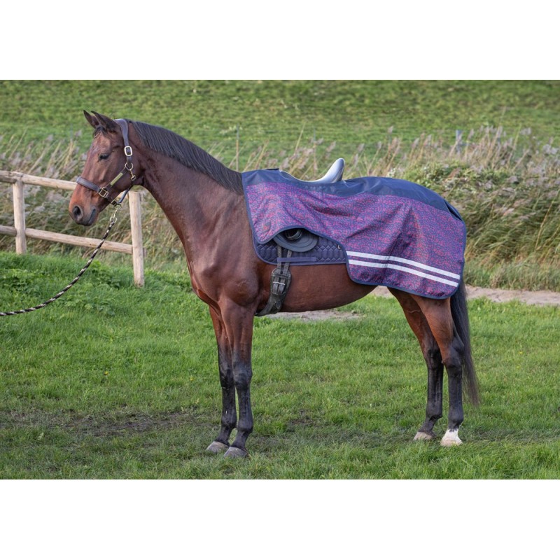 Couvre rein imperméable avec bandes réfléchissantes sur le côté pour une bonne visibilité dans l'obscurité. Sans couture sur le dos, équipée d'un passant pour la queue et dotée d'une doublure en polaire et d'une fermeture velcro pour la selle.