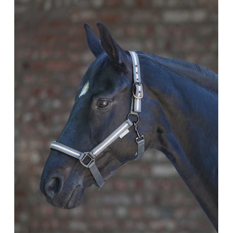 Licol moderne avec bandes réfléchissantes à la muserolle, aux montants et à la têtière.