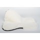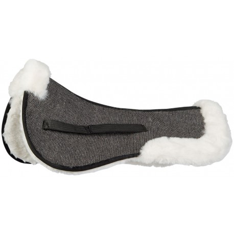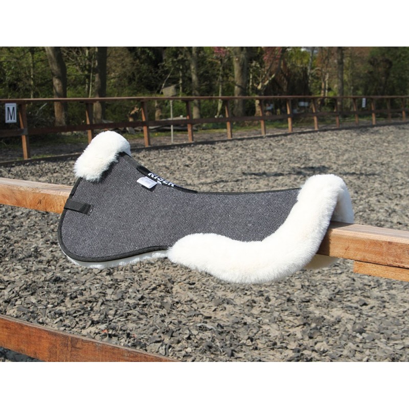Amortisseur avec dessous en fausse fourrure et dessus en feutre et toile. Un choix respectueux des animaux ! Les anneaux de sangle sont équipés de velcro.