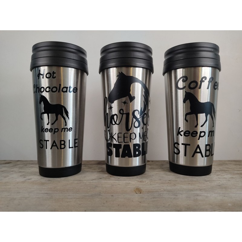 * Choice of three motifs: horse, chocolate or coffee.* Cup content:* Silver with black.* Thermo (keeps your drink hotter in winter).* Size: 450ml