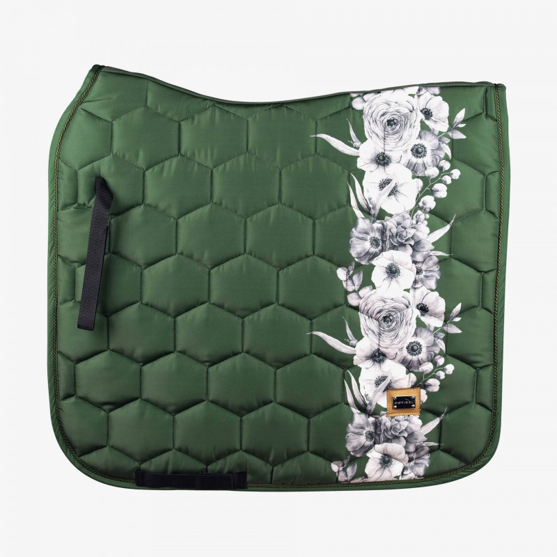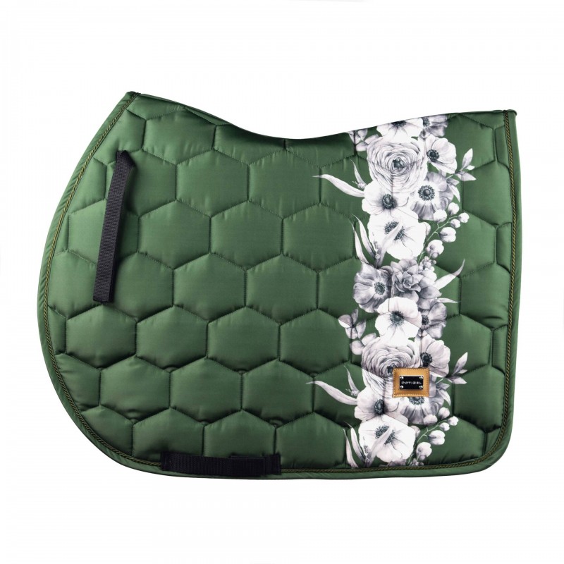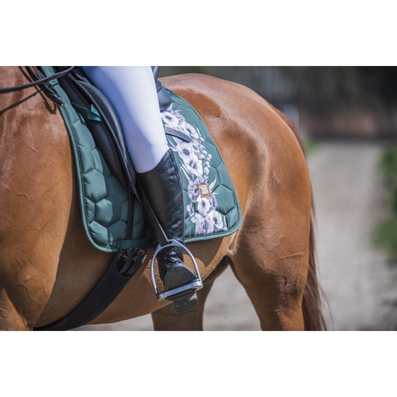 Saddle pad in green with grey flowers. The characteristic subtle satin glow of DotiBel enriched with elegant finishing: a cord in green and metallic logo badge give the pad the finishing touch. Contoured, anatomical shape and fastening of the girth straps ensure a perfect fit under the saddle.