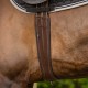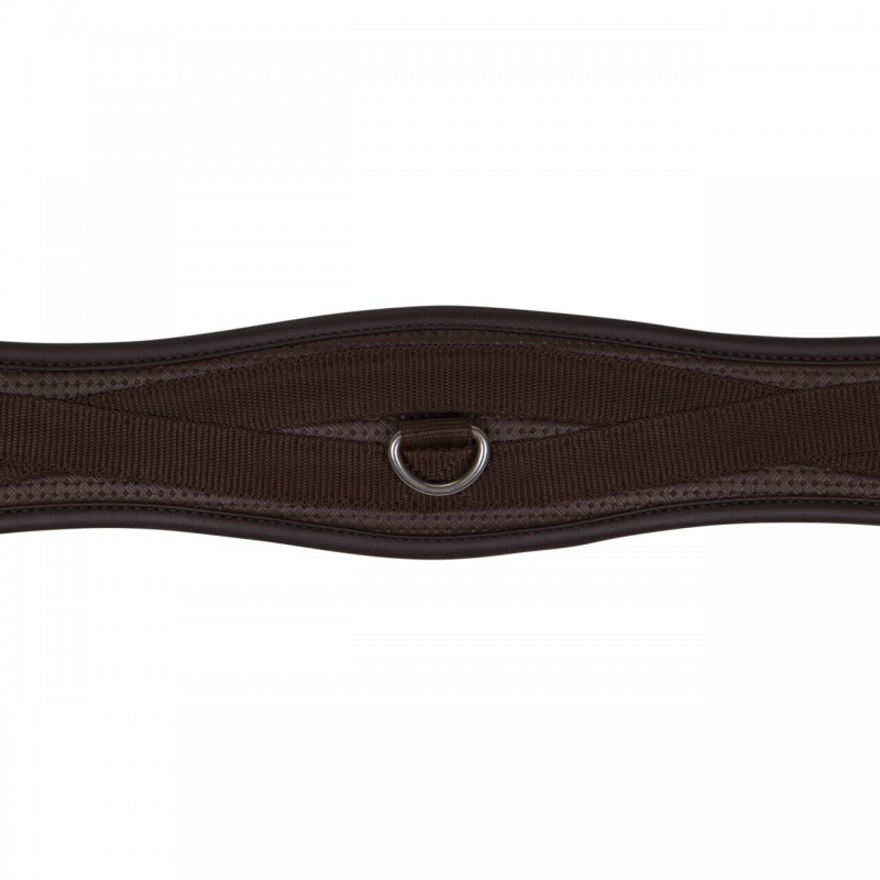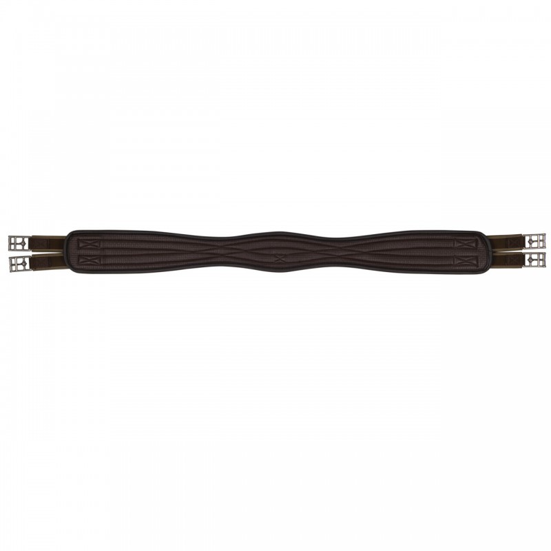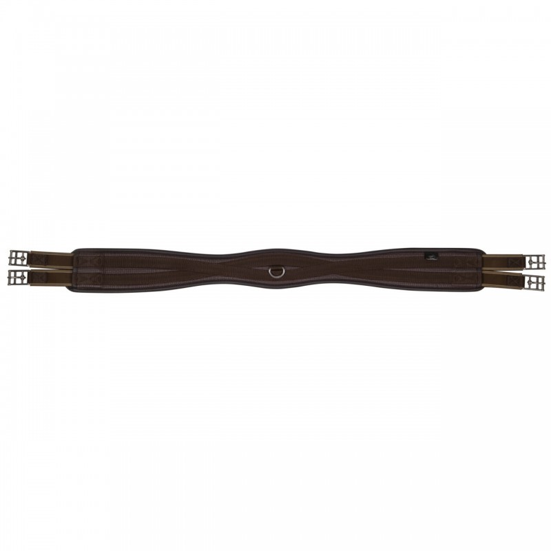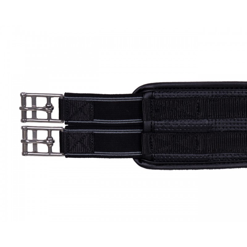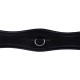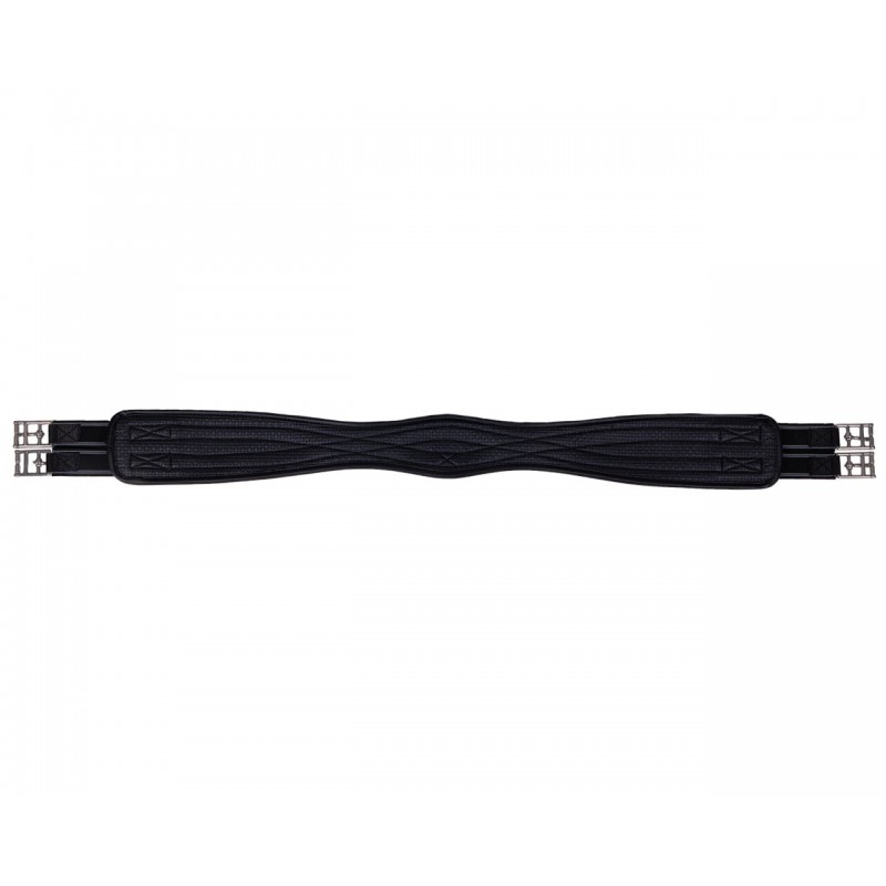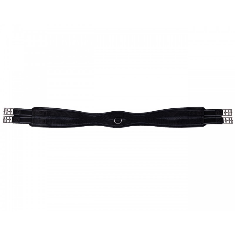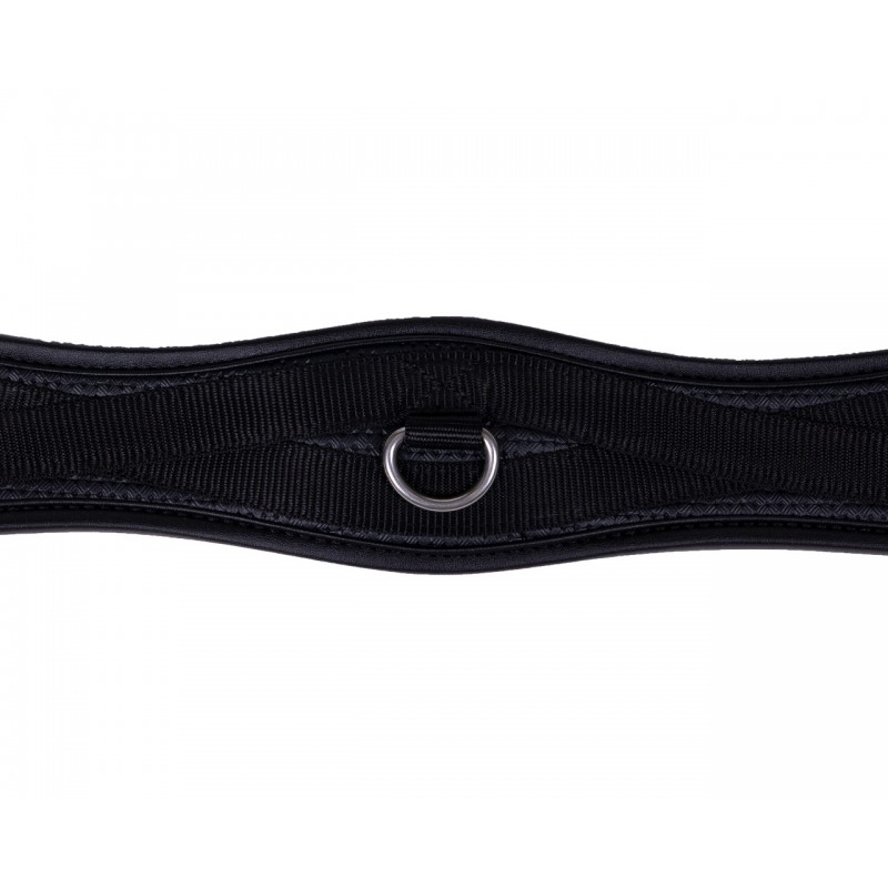 Beautiful black dressage girth in solid material. Because the girth is anatomically shaped, it offers greater comfort and freedom of movement. The girth has a ring in the middle for attaching German reindeer.