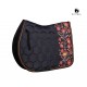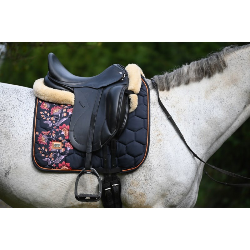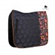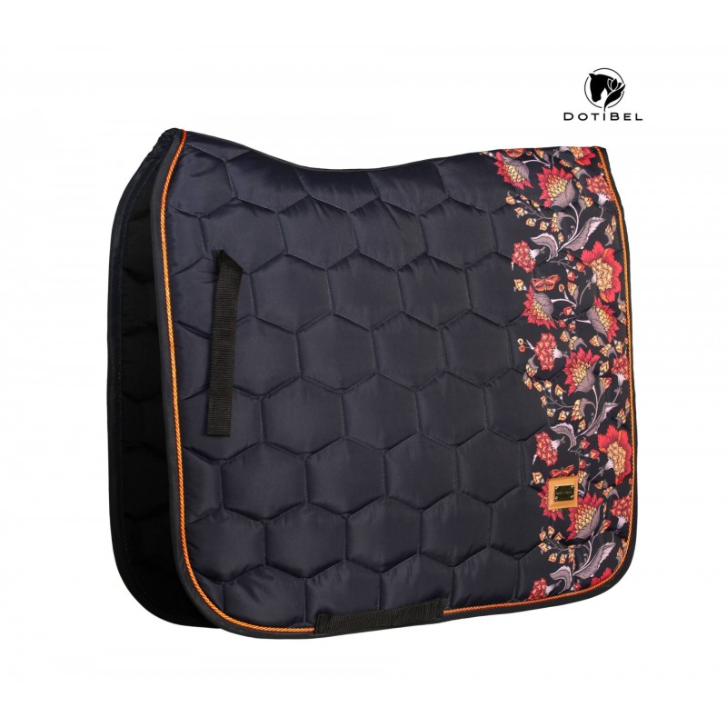 Saddle pad in black with red and orange flowers. The characteristic subtle satin glow of DotiBel is enriched with elegant finishing: orange cord and metallic logo badge give the pad the finishing touch. Contoured, anatomical shape and fastening of the girth straps ensure a perfect fit under the saddle.