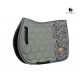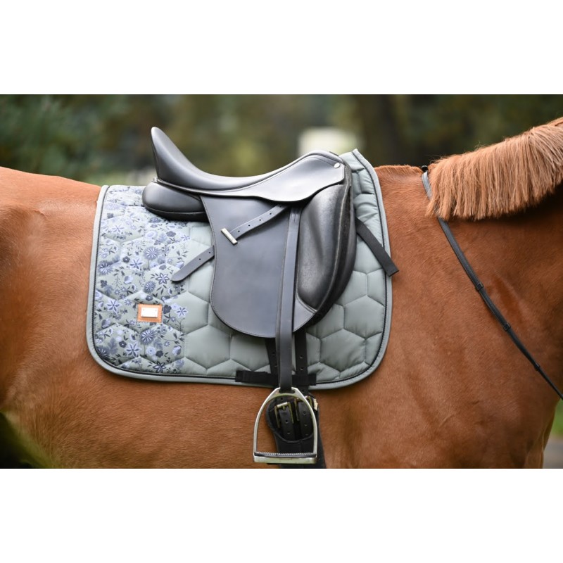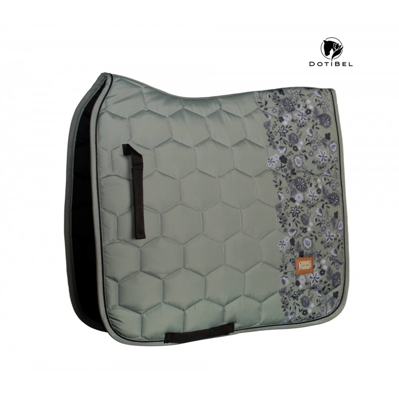 Saddle pad in olive green with grey flowers. The characteristic subtle satin glow of DotiBel is enriched with elegant finishing: a cord and metallic logo badge give the pad the finishing touch. Contoured, anatomical shape and fastening of the girth straps ensure a perfect fit under the saddle.