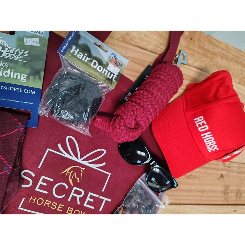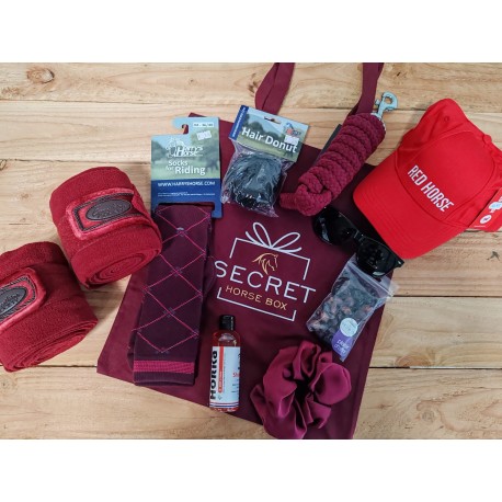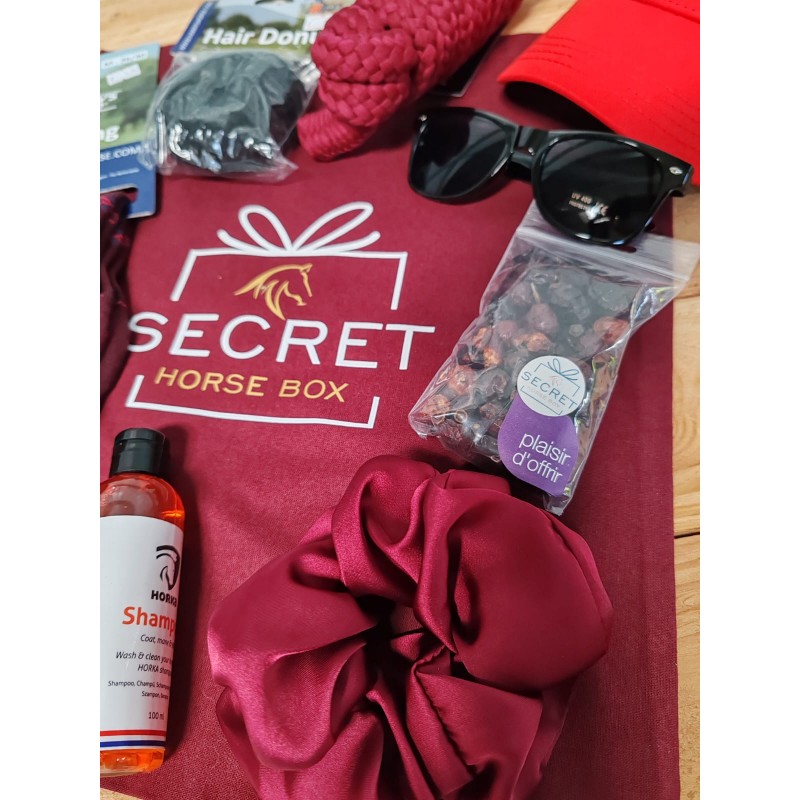 Value: €70The box includes: bandages, stockings (36-40), halter rope, cap, scrunchie, sunglasses, hair donut, shampoo horka and a bag of rose hips.Bag Secret Horse Box included.Colour: bordeaux