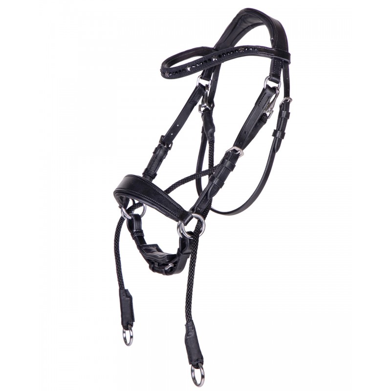 * Material: vegetable-tanned leather * Upholstery: polyurethane* Metal: stainless steel buckles* Bitless bridle with beautifully coloured browband* Part of the Thunderbolt collection
