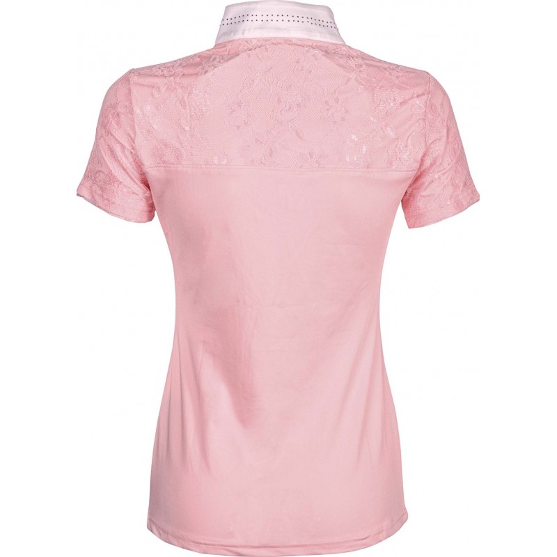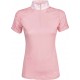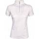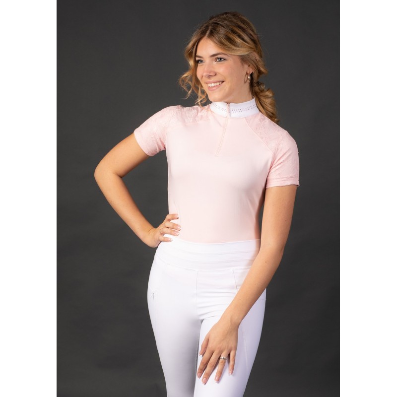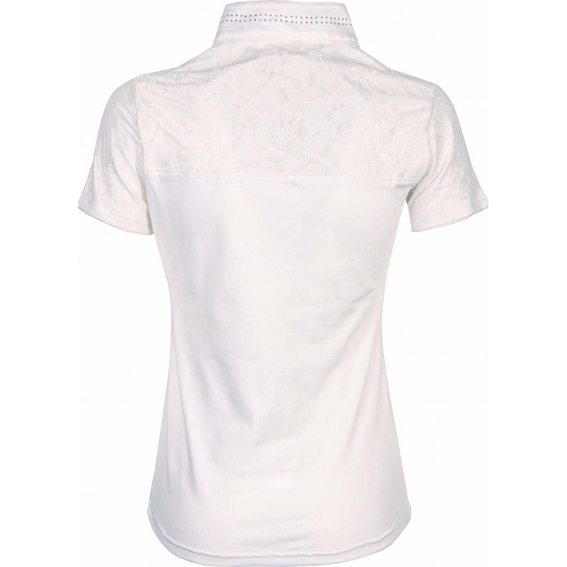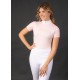 Competition shirt with white stand-up collar with a short zip and coloured crystals all around, partially lined with tone/tone lace at the front and back.93% Micropolyester 7% Elastane