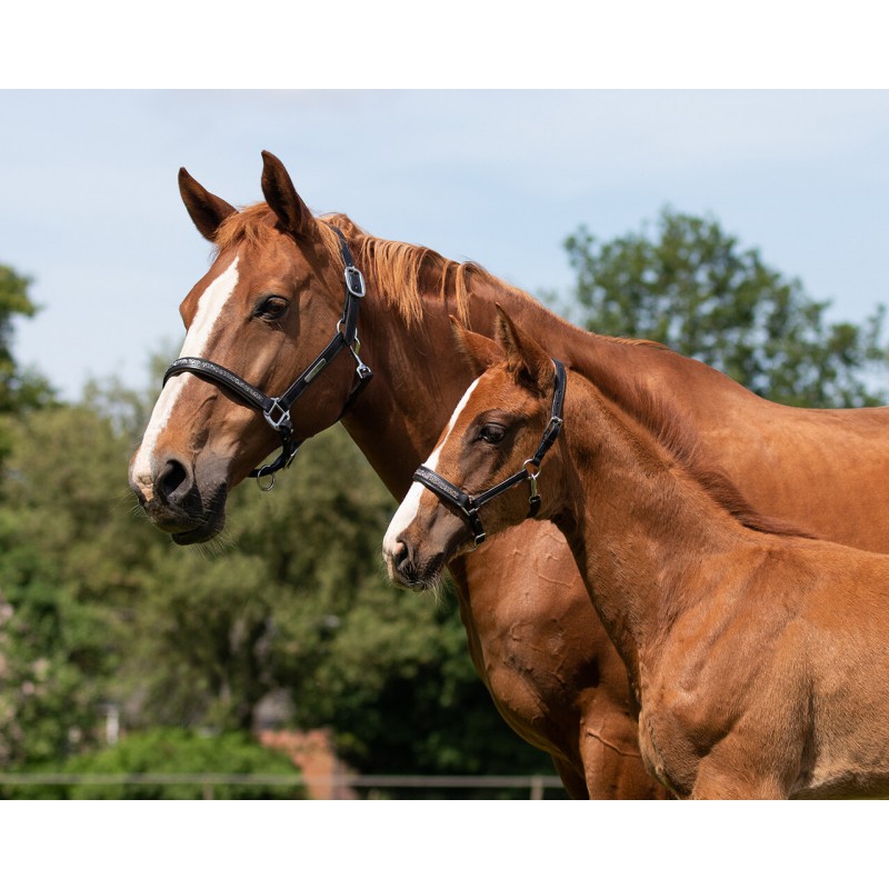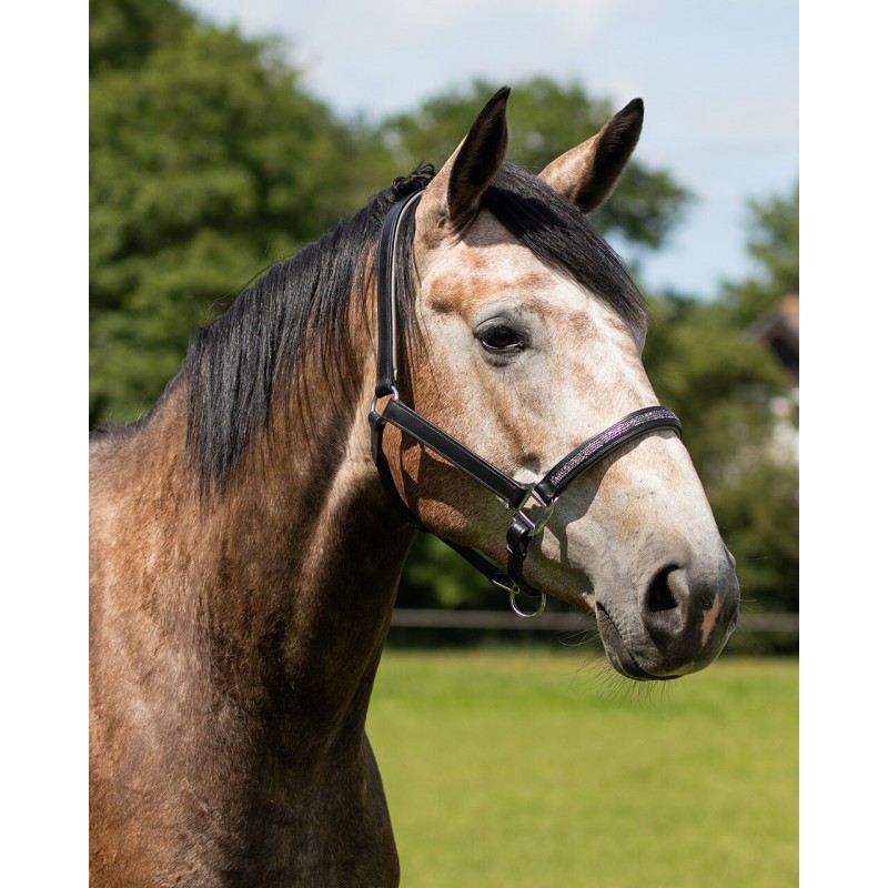 Stralend leren halster met chique uitstraling. Op de neusriem ingelegd met verspreide strass steentjes. Onderlegd op het kopstuk met zacht leer.