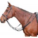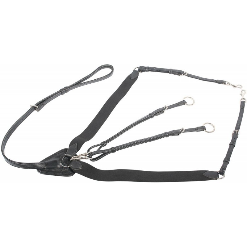 Elastisch voortuig van soepel leder met afneembare martingaal en zachte padding op het borststuk. De schouderriemen zijn voorzien van elastische inzet voor extra comfort en bewegingsvrijheid en makkelijk aan het zadel te bevestigen d.m.v. musketon. Het voortuig kan met de verstelbare singellus aan de singel worden bevestigd.