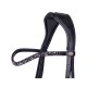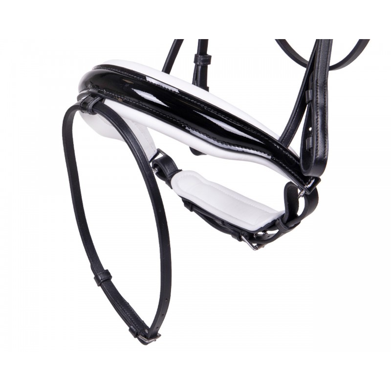 Dit elegante hoofdstel met lakleren neusriem is de perfecte combinatie van elegantie en comfort. De frontriem is bedekt met diamantvormige strass-steentjes die prachtig schitteren. Het anatomisch gevormde kopstuk en de zacht gevoerde neusriem maken het hoofdstel zeer comfortabel om te dragen.