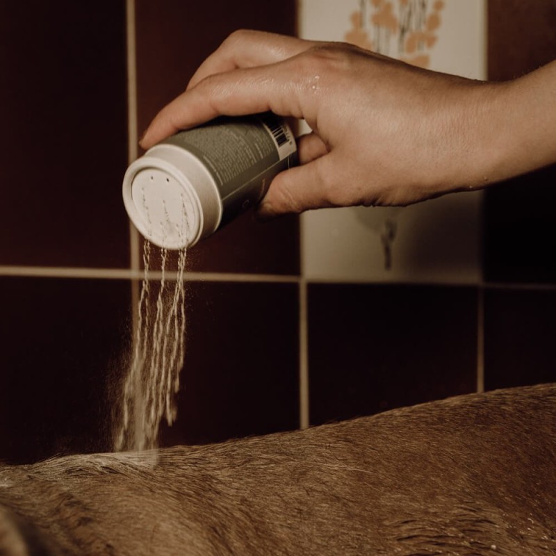 Schudden voor het aanbrengen. Nadat u uw hond goed nat hebt gemaakt, royaal strooien en het shampoeder gelijkmatig verdelen. Masseer in tot een schuim, laat enkele minuten intrekken en spoel dan grondig tot het water helder stroomt. Idealiter eindigt u met het afdrogen en borstelen van uw hond.